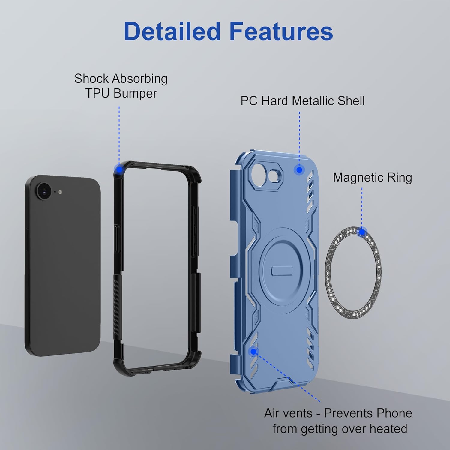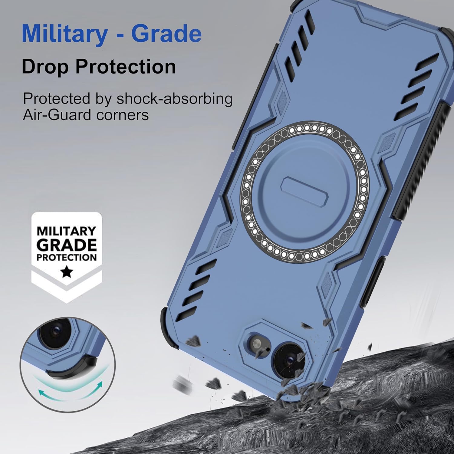 [Material]: Made with high-quality shock-absorbing TPU bumper, sturdy PC metallic shell, and an integrated MagSafe Ring for MagSafe support. Smart airflow design with open vents helps prevent the phone from overheating during extended use or charging.