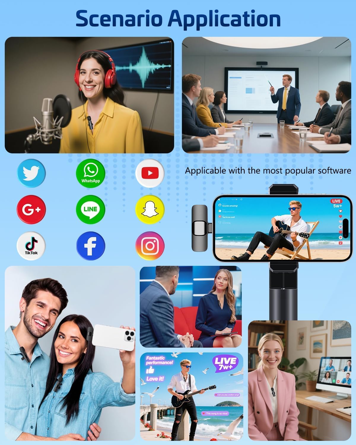 Applies to software such as YouTube, Facebook, TikTok. As an external microphone for iPhone, it is very useful in scenes such as live broadcast, interview, online course and video recording.