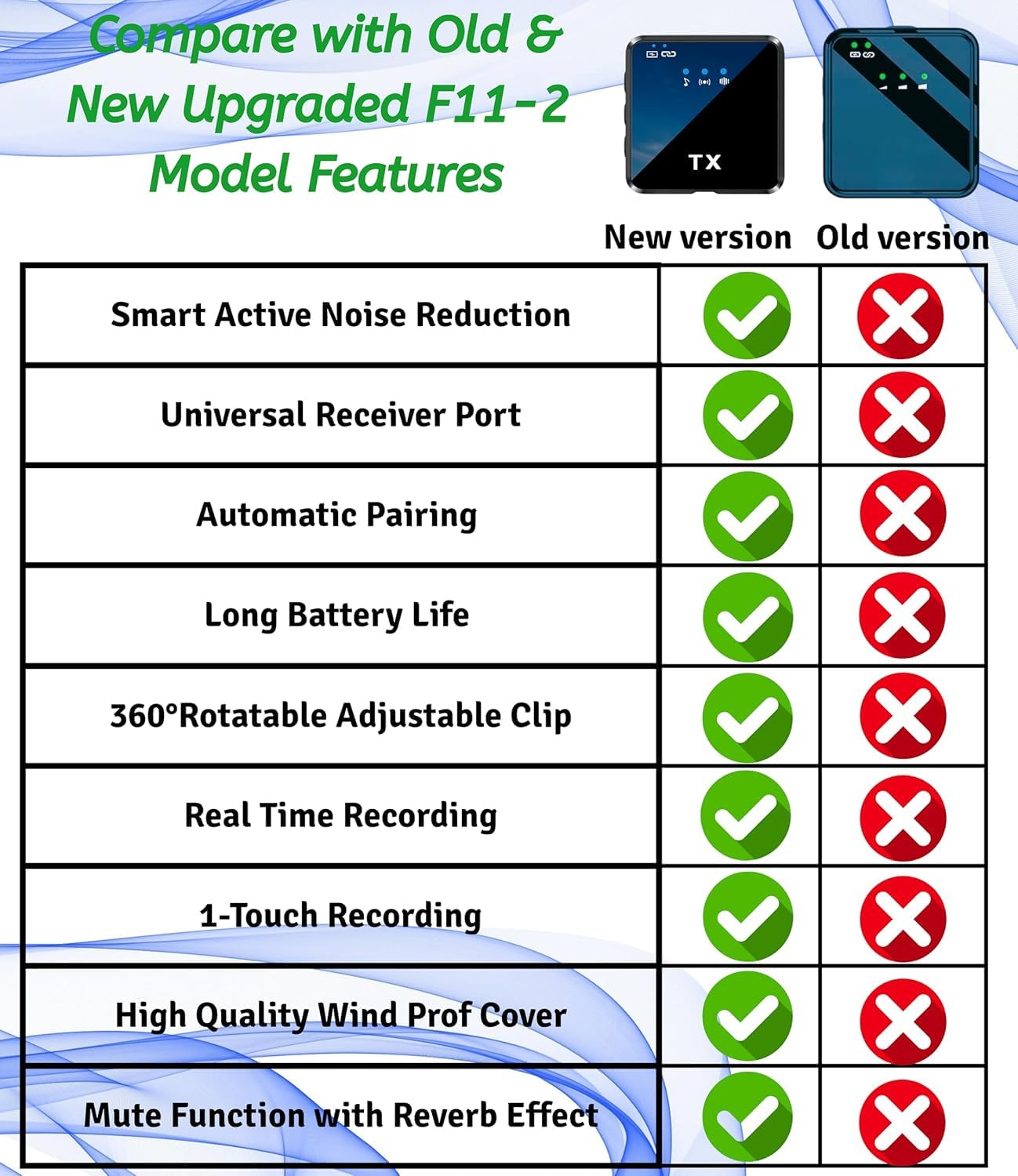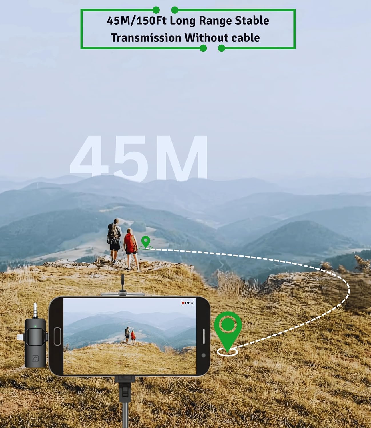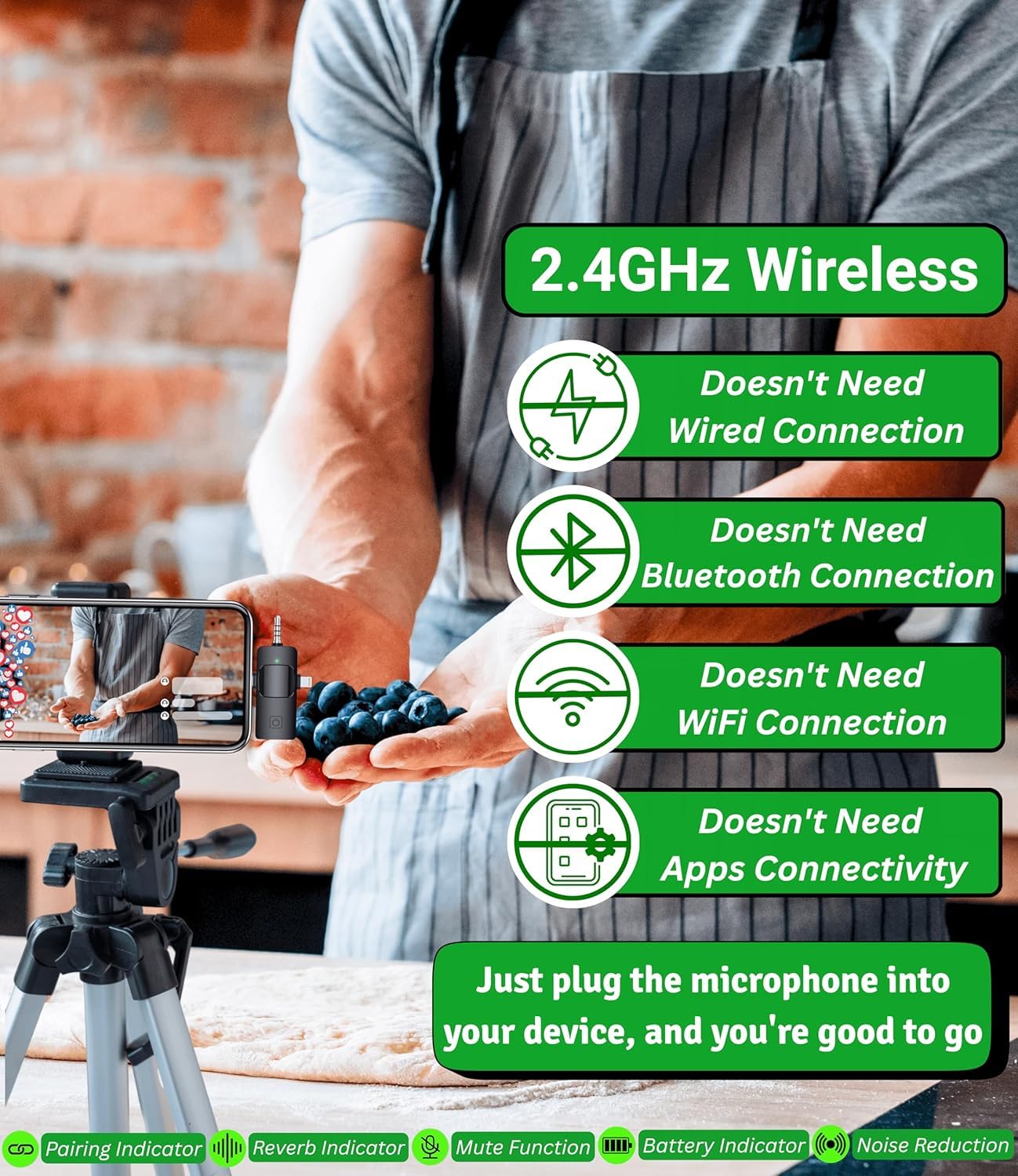 Dual wireless design for 2-person recordingLong battery life for continuous shootsPlug & play – No app or Bluetooth neededSmart noise reduction for crisp vocals
