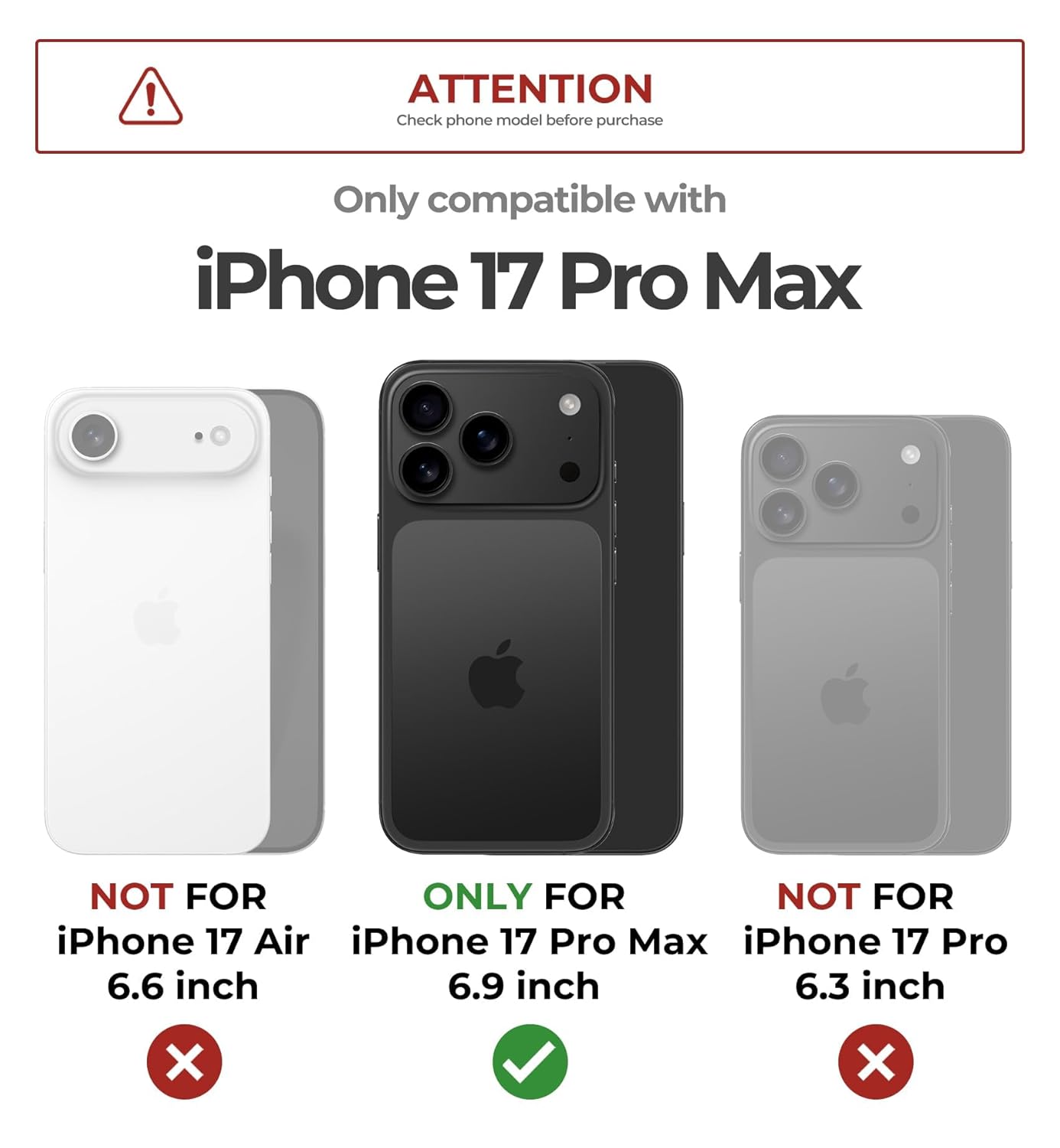 【Compatible for iPhone 17 Pro Max Case】Designed specifically for iPhone 17 Pro Max phone, the case fits perfectly and allows easy access to all ports, buttons and camera functions. ONLY compatible for iPhone 17 Pro Max Phone 2025 (6.9 inch). Please Confirm Your Model Before Purchasing.