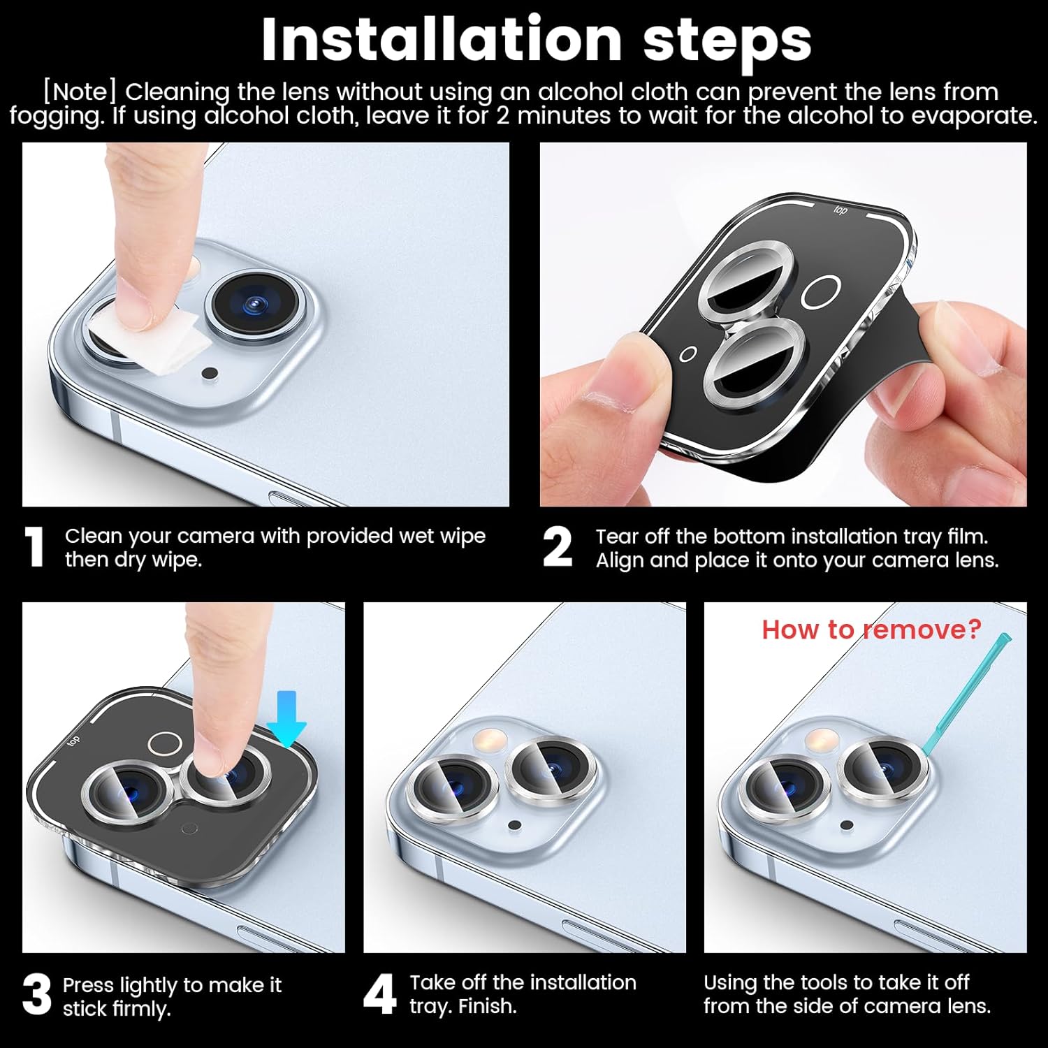 [One-step installation] The camera lens protector for Iphone 13 is embedded in an acrylic positioning frame, just use our cleaning accessories to clean the lens, tear off the back protective film, align the camera lens and remove the positioning tray, the installation is done. All 3 individual camera lens covers are installed successfully at the same time, which is a very simple and considerate installation design. No bubbles and the lens cover will stick tightly for a perfect fit.