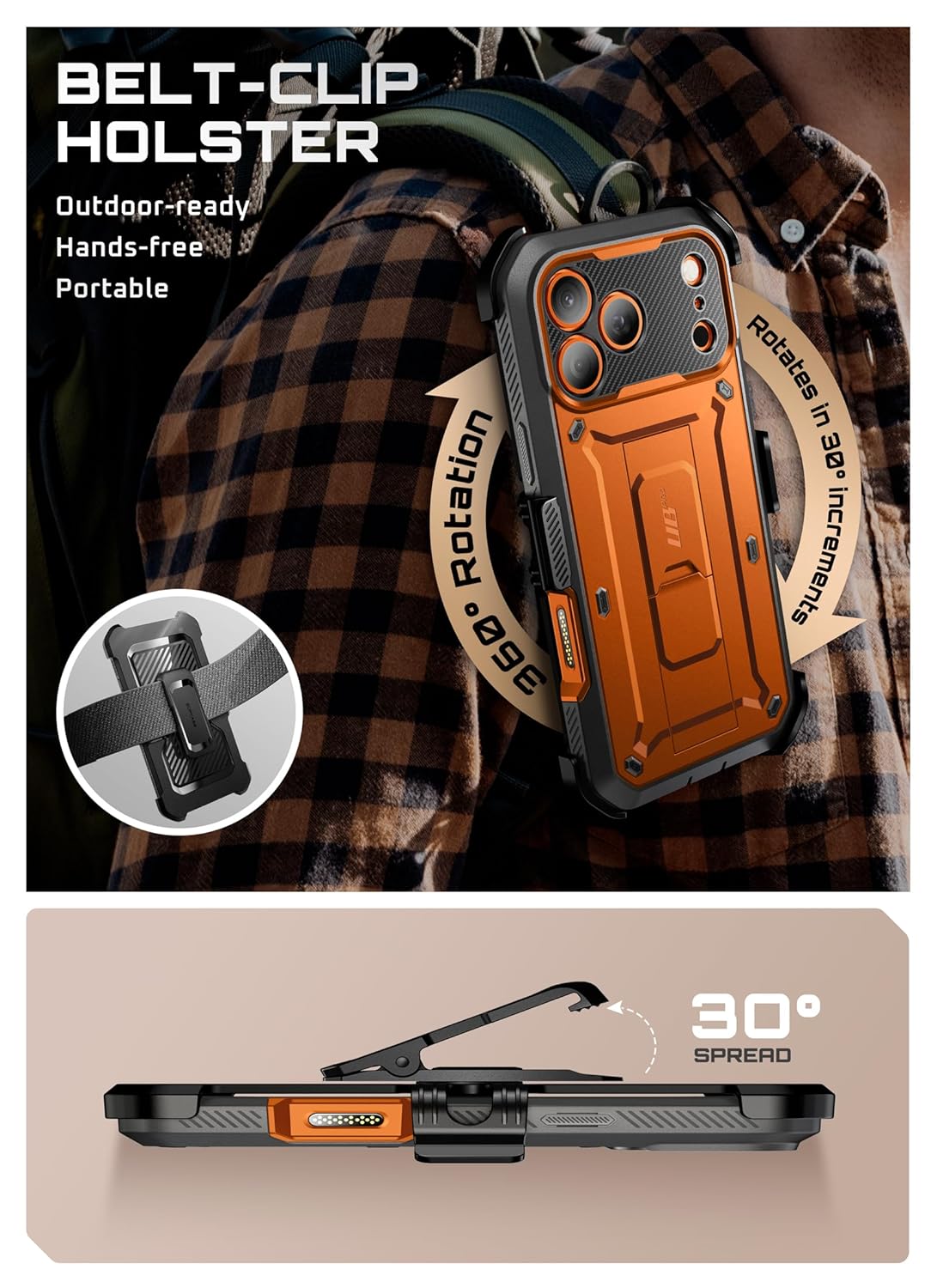 A detachable 360° belt clip is included. The fully rotating holster provides hands-free convenience, while secure side clasps let you snap the case on and off effortlessly. Ready for work, travel, and outdoor adventures.